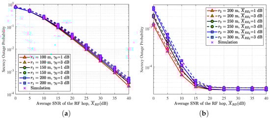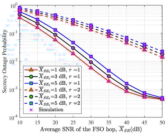 Figure 2 investigates the relationship between the average SNR of the FSO hop () and different detection techniques (r). The SOP decreases as increases. However, this decreasing trend slows down at larger , caused by the DF protocol, which determines the SOP performance of the dual-hop system based on the worst link. Moreover, as increases, the SOP also increases due to intercepting more signals from the legitimate link. Furthermore, the SOP under heterodyne detection is lower than that under the IM/DD technique. For example, when dB and dB, the SOP decreases from 0.19 to 0.015 as the detection technique shifts from the IM/DD technique to heterodyne detection. This can be attributed to the higher conversion gain and improved filtering performance associated with heterodyne detection.