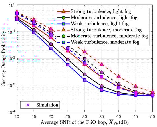 Figure 3 shows the impact of various turbulence conditions and fog intensities on the SOP. The Monte Carlo simulation results align with the numerical results. Similar to Figure 2, the SOP decreases with increasing . Additionally, more severe turbulence conditions increased the SOP. For instance, the SOP increases from to when the turbulence condition transitions from weak to moderate with light fog intensity and at 30 dB. This is because the more severe atmospheric turbulence condition leads to a higher outage probability, resulting in less signal received by the receiver. Although the signal obtained at both the legitimate and eavesdropping receivers decreases, the impact on the legitimate link is greater than that on the eavesdropping link due to the larger signal received at the legitimate receiver. Furthermore, an increase in fog intensity results in a higher SOP. For instance, when the turbulence condition is weak and dB, the SOP increases from to with the fog intensity transitioning from light to moderate. This is explained by the reduction in fog intensity, which decreases the signal intensity at the receiver, thereby leading to a higher SOP.