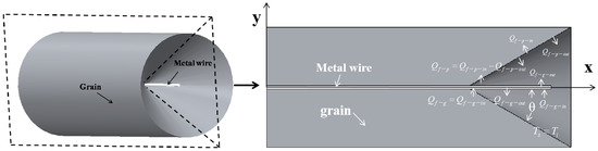 For the heat convection mode between the metal wire and the grain, the heat transfer was defined as Equations (13)–(16). The heat transfer of the metal wire changed from the entry to the exit. Due to the fact that the metal wire and grain were close to each other, there was no radiation. It was assumed that all the components of the grain were symmetrical and that the heat conduction coefficient of the grain was a fixed value. At the same time, the heat change in the metal wire per unit volume could also be defined by Equation (17). In Equation (14), the incoming heat is divided into two parts; one is the axial heat transfer along the metal wire and the other is the lateral heat transfer. Moreover, is the heat flux and is the cross-section perimeter of the metal wire.