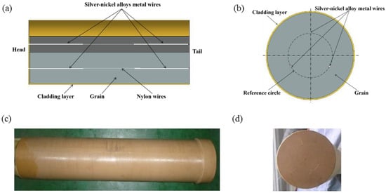 (a) Cross-section along the axial direction of the grain model with discontinuous embedded silver–nickel alloy metal wires; (b) cross-section along the radial direction of the grain model with discontinuous embedded silver–nickel alloy metal wires; (c) profile of the physical grain; (d) head of the physical grain.