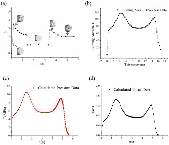 Eventually, the burning surface curve with the thickness variation was established. The curve of the burning surface is shown in Figure 3b, which shows expected pattern changes, namely first increasing, then decreasing, followed by an increase and a subsequent decrease. According to the internal ballistics Equations (1) and (26), the pressure curve with time of which is shown in Figure 3c, the thrust curve with time is shown in Figure 3d.