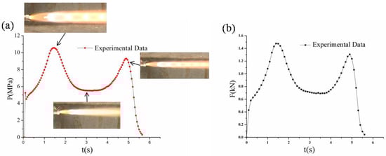 (a) Pressure curve of the grain with discontinuous embedded silver–nickel alloy metal wires; (b) thrust curve of the grain with discontinuous embedded silver–nickel alloy metal wires.