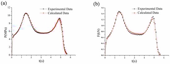 (a) Pressure curve comparison between the experiment and the calculation of the grain with discontinuous embedded silver–nickel alloy metal wires; (b) thrust curve comparison between the experiment and the calculation of the grain with discontinuous embedded silver–nickel alloy metal wires.