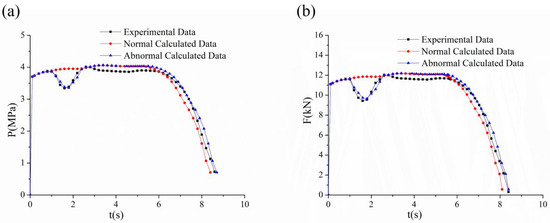 The internal ballistic curve of the solid propellant column with continuously embedded metal wires should be rather stable and the experimental curve should be similar to the normal calculated data. However, sometimes there was an unexpected decrease followed by an upward change during actual SRM testing, as shown in Figure 6a. Within the range from 1 s to 2 s, there was a maximum pressure drop of 1.2 MPa, and the operation time increased by 0.3 s. This trend was very similar to the pressure and thrust curves of the segmented embedded metal wires’ grain, wherein the thrust initially dropped and then returned to normal. Therefore, through continuous attempts to identify the starting point of the break and the length of the broken metal wire, after many trials, it was found that the calculated curve closely matched the abnormal curve obtained from the experiment when the break length was set to 5.2 mm and the starting point was 21.6 mm away from the head. In Figure 6b, the thrust also exhibited a noticeable decrease, with the maximum drop being 2.3 kN. These findings were similar to those found in the master’s thesis of Paul B. Wilson [22], wherein the presence of breakpoints in metal wires led to a trend in the pressure and thrust curves of a first decline followed by an increase.