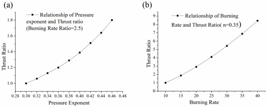 (a) Relationship of pressure exponent and thrust ratio (burning rate ratio = 2.5); (b) relationship of burning rate and thrust ratio (burning rate ratio = 2.5).