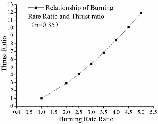 There are many materials that can play the same role in increasing the burning rate of grain, such as silver wires, copper wires, and so on. The burning rate ratio could change from 1.0 to 5.0 for different materials. Therefore, we can compute the thrust ratio for end-face burning grain with different embedded metal wires. As shown in Figure 8, the thrust ratio could reach 12.5 when the burning rate ratio was 5, and we could regulate the thrust by choosing different materials for the metal wires. In reference [19], the authors conducted calculations on the impact of thermal properties of different metallic materials on the acceleration ratio. The results showed that the acceleration ratio varied with different diameters, ranging from 1 to 4.2. This is consistent with the acceleration ratio assumption of 1 to 5 in this study.