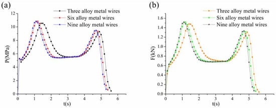 The number of metal wires had a discernible impact on both pressure and thrust. Thrust calculations were conducted using three, six, and nine silver–nickel alloy wires. As depicted in Figure 9a, the pressure change for the three-wire configuration was the slowest, while the pressure change for the nine-wire configuration was the fastest. With an increasing number of wires, both the ascent and descent of pressure occurred more rapidly, indicating that a higher wire count corresponded to a greater pressure adjustment capability. A comparison of the pressure among three, six, and nine wires revealed significant variation between three wires and six wires, whereas the variation between six wires and nine wires was minimal. This suggests that the pressure-adjusting capacity of wires approached its maximum with an increasing number of wires, and thrust experienced minimal change with additional wires. The thrust curves exhibited a similar trend to the pressure curves, as illustrated in Figure 9b. This calculation result corresponds with the findings in reference [22], which indicated that, the greater the number of metal wires, the faster the pressure and thrust curves rise and fall.