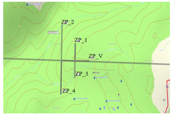 In Figure 1, ZP_V is the initial position of the leader of the group of UAVs, and ZP_i, i = 1, 4 are the initial positions of the members of the group of UAVs, 1 to 4. Other group members, at designated distances for the flight duration, follow the group leader. Based on data from other UAVs, other group members determine its position. The coordinates of the initial position of the members of the UAV group are shown in Table 1. When creating a model of the movement of five flying UAVs, they chose the formation they would fly in. At the head of the formation is the leader of the group, and to its left and right sides are two UAVs. In developing the model, a condition was observed that the maximum distance between the group’s leader and any group member should not exceed 1000.0 m. We assumed that the group would form in the surrounding area of the Sliač airbase and fly eastward at an altitude of 1850.0 m. The initial position of the group is shown in Figure 1. The distance between group members is at least 300.0 m.