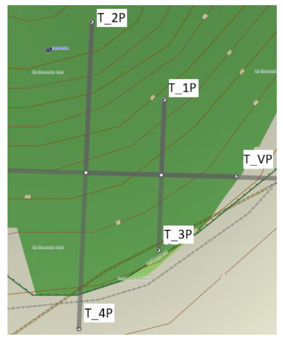 In Figure 2, T_VP is the position of the leader of the group of UAVs, and T_iP, i = 1, 4 are the positions of the members of the group of UAVs, 1 to 4. The coordinates of the positions of the UAV group members at the end of a rectilinear flight are provided in Table 2. The motion model of the initial flight phase of five UAVs (rectilinear flight) was created based on these assumptions. We assumed a straight flight at an altitude of 1850.0 m. The initial coordinates of the five UAVs are shown in Table 1. When creating the flight trajectory model, we used knowledge from our previous works [26]. We assumed a rectilinear flight throughout the line, which can be described by the equation of a line in a three-dimensional space. The line in the space is provided by two points or one point and a direction vector. Line Xk XP may be defined as follows: the line goes through the starting point and the final point . The endpoint coordinates are presented in Figure 2 and Table 2.