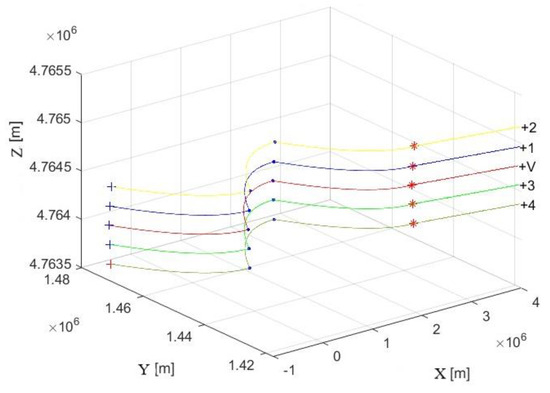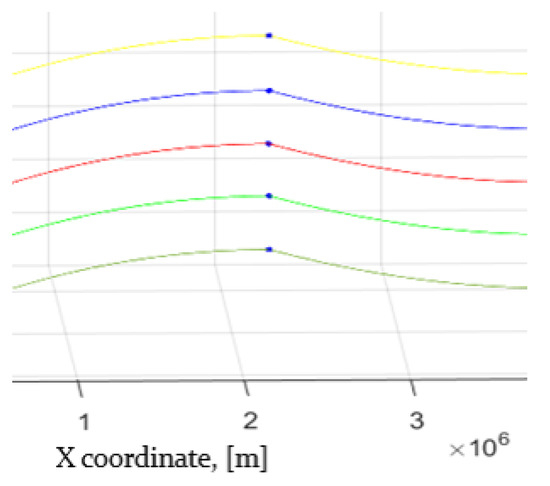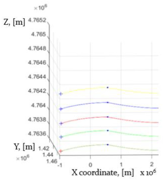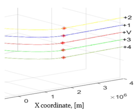 We assumed that these coordinates are considered to be the reference and represent the start point of the flight trajectory, , where . When modeling the movement of a group of UAVs, we set the condition that this group’s flight trajectory will contain one rectilinear section and three curvilinear sections in the shape of a circle.