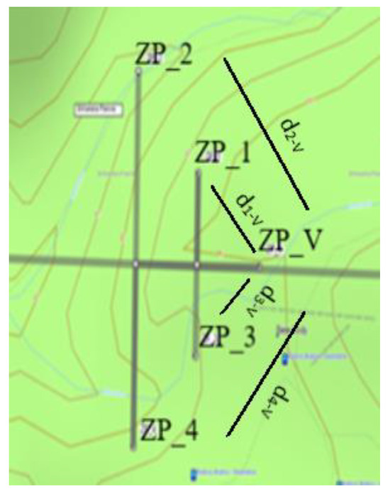 We assumed that all UAVs work in the communication network (see Figure 7) and transmit in short time intervals, among other things, messages on their positions. The time of signals spreading between the UAV’s transmitter ZP_i, i = 1 to 4, and the group leader’s receiver ZP_V is directly proportional to the distance between them. Measuring the distances, di-v, i = 1 to 4, between UAVs ZP_i and the group leader ZP_V, it possible to determine the group leader’s location if we know the positions of the individual UAVs. The position of the group leader ZP_V against other users of communication network ZP_i, i = 1 to 4 is demonstrated in Figure 7.