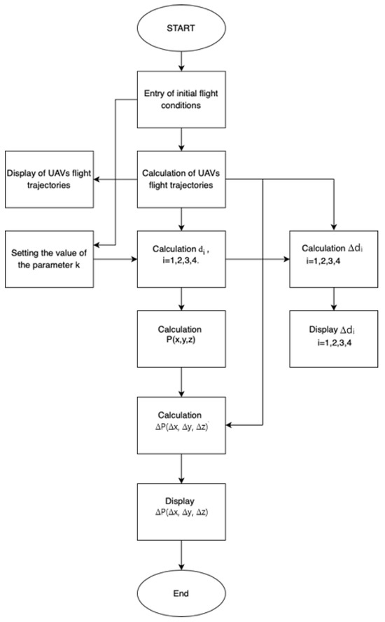 The flight simulation flow diagram of a group of UAVs and the determination of the position of the group leader is shown in Figure 8. After entering the initial flight conditions, the flight trajectory of the group of UAVs was calculated and displayed. Subsequently, errors were generated in determining the coordinates of the four members of the group of UAVs and in measuring the distance between the individual UAVs and the group commander. The generated errors were added to the flight coordinates of the UAVs, and the position of the group leader was calculated. Based on the comparison of the calculated position of the group commander with the simulated trajectory of its flight, the errors in determining its position were determined. Then, these errors were recorded graphically.