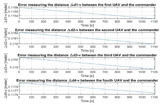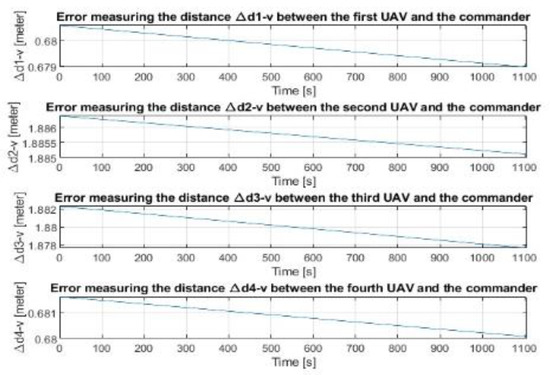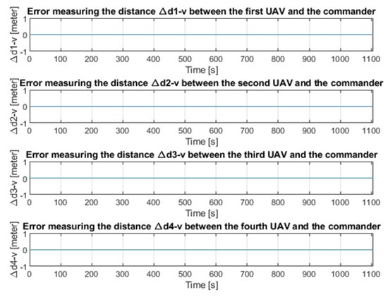Figure 9 clearly shows that we knew the exact distances between the group commander and the individual UAVs. Therefore, the distance measurement errors were zero. In this simulation, we assumed that we knew the exact positions of the individual UAVs.