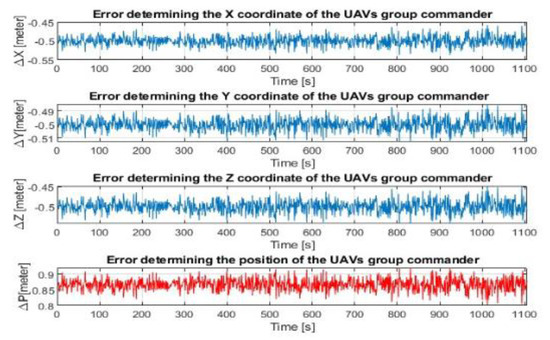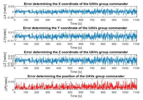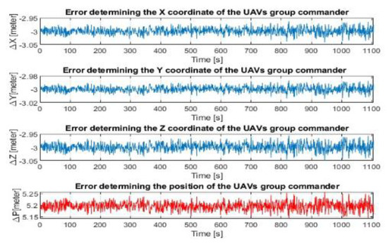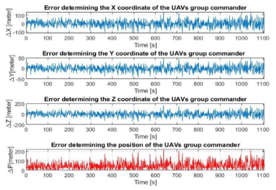 The simulation results confirmed that when the constant k changed from 0 to 20, the errors of determining the coordinates y and z of the group commander changed in approximately the same range as the errors of determining the coordinate x of the group commander. The simulation results showed that if the errors in determining the coordinates of the members of the group of UAVs increased, then the errors in determining the coordinates of the group commander increased. The accuracy of determining the position of the group commander was also influenced by the accuracy of determining the distance between individual UAVs and the group commander. When the constant k was increased, the errors in determining the position of the group commander increased. Based on this, we can conclude that for accurate determination of the position of the group commander, the errors in measuring the distance between individual UAVs and the group commander must be less than 1.9 m.
