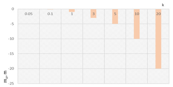 In this way, we gradually checked the influence of the inaccuracy in determining the coordinates of individual UAVs and distance measurement errors between individual UAVs and the group commander for the constant k, equal to 0.05 to 20, which corresponded to distance measurement errors from 0.01 to 12.0 m. The simulation results are presented in Figure 16, Figure 17, Figure 18 and Figure 19. Figure 16 shows the mean values of the errors of determining the coordinate x group commander mx for the constant k = 0.05 to 20. The mean values of the errors of determining the coordinate x group commander ranged from −0.05 m to −20.0 m.