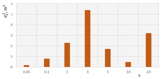 The variance of group commander x coordinate determination errors, σ2x, for the constant k = 0.05 to 20.