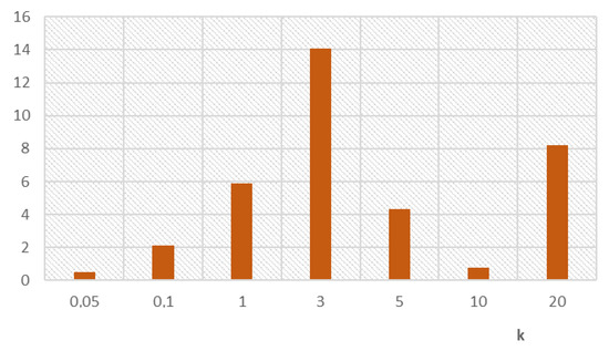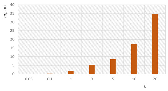 The simulation results confirmed that when the constant k changed from 0 to 20, the errors in determining the group commander’s coordinates y and z changed in approximately the same range as the errors in determining the group commander’s coordinate x. Figure 18 shows the mean values of group commander mp position determination errors for the constant k = 0.05 to 20. The mean values of group commander position determination errors ranged from 0.11 m to 34.65 m.