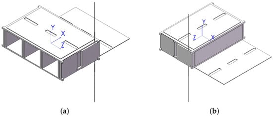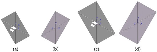 In the case of post-sail-deployment scenarios, the scale of the characteristic length is determined by the span of the sail. Consequently, the body structure can be simplified to flat boxes. In the simulation cases presented in this study, the thickness of the sail has a negligible impact on the results. Therefore, to avoid introducing multi-dimensional issues and to ensure the fitness of the mesh, a sail thickness of 1 mm is assumed. It should be noted that the asymmetry stemming from the deployed solar panel is also taken into account. Panel constructions of the CubeSat with both sail sizes are shown in Figure 6.