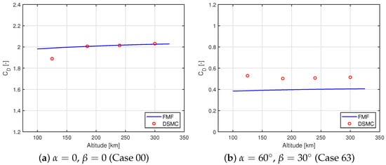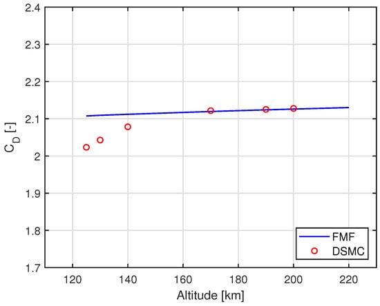 A flat plate with a characteristic length of 1 m was used for the validation of the FMF theory in calculating [31]. The result (see Figure 4) indicates that FMF fits the DSMC result well for altitudes higher than or equal to 170 km due to the increasing rarefaction of the atmosphere.