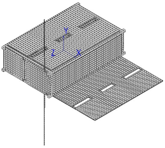 For pre-sail-deployment scenarios, MOVE-III exhibits an identical configuration to that used when conducting scientific endeavors in orbit. Nevertheless, the actual complete assembly is too intricate to be incorporated into the SPARTA kernel of the DSMC method. As a result, the assembly needs to be simplified (see Figure 1 in Section 2). In this study, the surface details of the CubeSat are disregarded, while substantial elements, such as the deployable antenna and solar panel, are preserved. The panel construction of the CubeSat without a sail is shown in Figure 5.