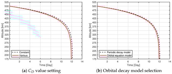 As depicted in Figure 11, the prediction results indicate that the decay process is influenced by the value. When compared to scenarios with a constant , the deorbiting time in cases where varies is slightly shorter. This is attributed to the reduction in as the CubeSat descends to lower altitudes. Furthermore, both the periodic decay model and the orbital equation model are employed to forecast the trajectory of MOVE-III equipped with a 4 m2 drag sail, serving as a means of validation. The variable values, corresponding to different orbital altitudes, are derived through interpolation from the results presented in Section 4.