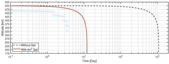 The DSMC results show that the of LEO spacecraft varies with the change in orbital altitude. Due to the aerodynamic stability of the drag sail [41], the only attitude that needs to be considered is Case 00, i.e., , . The values of this attitude at different altitudes are obtained in Table 6 of Section 4.3. These data are interpolated over the altitude range. The initial altitude is set to 500 km, which is a typical LEO altitude and the likely operating orbit of MOVE-III. To be concise, the perturbation due to the orbital environment is ignored, and parameters are assumed to be constant. The mass of MOVE-III is 7 kg, the cross-sectional area is 0.039 m2 (without drag sail) or 4.36 m2 (with drag sail), the solar radio flux is 160 SFU, and the geomagnetic index is 5. The altitude decrease with time is then calculated and shown in Figure 12.