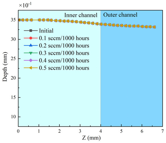 In order to study the influence of the propellant flow rate on thruster erosion, we adopted a similar methodology to investigate the effects of the varying flow rates. As illustrated in Figure 13, we kept the flow rate constant, and the thrust was generated from non-conservative forces, thus allowing us to calculate the voltage values. With the increase in flow rate, the corrosion depth of the thruster’s wall surface showed little variation. This phenomenon can be attributed to the relatively small thrust generated by non-conservative forces. Consequently, under higher-flow-rate conditions, the theoretical voltage required is lower, resulting in ions possessing less energy that fail to exceed the threshold of the sputtering erosion model. As a consequence, the impact on the thruster’s wall surface remains minimal, and the erosion is limited even at higher flow rates. As shown in Figure 13, an increase in flow rate leads to a corresponding increase in the thrust generated by the thruster. This can be primarily attributed to the greater number of propellant particles involved in the ionization process within the thruster. However, due to the constraints imposed by the required thrust, the acceleration voltage needed remains relatively low (around 100 V). As a result, most xenon ions do not possess sufficient energy to exceed the threshold for material sputtering. Consequently, the increase in flow rate has little impact on the erosion of the surface morphology.
