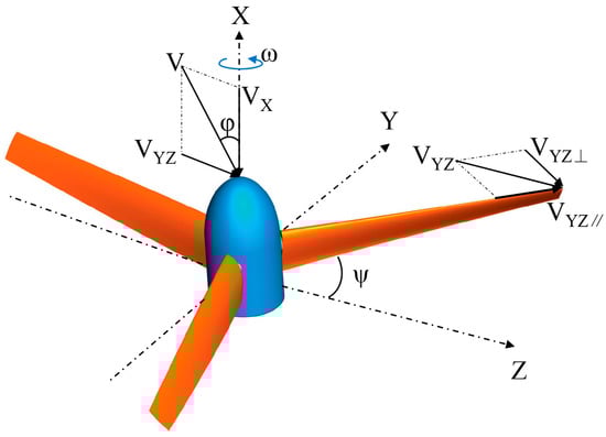 Figure 2 shows the coordinate system of each velocity component of the propeller, where the direction perpendicular to the direction of the propeller disc is considered as the X-axis. In addition, the plane in which the propeller disc is located is defined as the YZ-plane, and φ denotes the angle between the inflow velocity V and the X-axis of the rotational axis of the propeller disc. Therefore, the incoming velocity V can be decomposed into the axial component VX and the tangential component of the propeller disc VYZ, given in Equations (9) and (10), respectively.