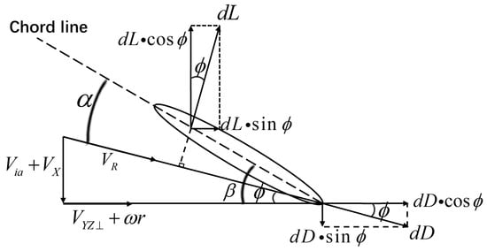 where Via denotes the axial induced velocity of each segment of the propeller blade, dL denotes the instantaneous lift perpendicular to the relative velocity VR, and dD denotes the drag along VR.