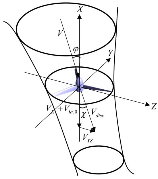 where Via,0 is the induced velocity at the center of the propeller on the propeller plane, and R denotes the total radius of the propeller. Figure 4 is a schematic diagram of the propeller wake deflection, χ is the wake skew angle given by: