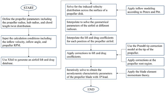 The procedure for calculating the propeller 1P load is described in Figure 6. In the first step, we start by defining the basic parameters of the propeller such as the number of propeller blades, radius, hub radius, blade chord length, and twist distribution. In the second step, the calculation conditions such as inflow angle, inflow velocity, and other operating conditions are specified. In the third step, Xfoil V6.94 is used to generate a database of lift and drag coefficients for the airfoil and import them into the MATLAB procedure. Next, the inflow model established by Peters and Pitt is introduced and the resulting equations are solved iteratively for the induced velocity distribution on the propeller disc. In the fifth step, the interpolation of the solution gives parameters such as chord length and blade angle at any radius of the propeller blade. Next, the lift drag coefficients are called from the database and interpolated to solve for the lift drag coefficients at each position of the propeller airfoil. Then, the Prandtl tip correction model is applied to correct at the propeller blade tip, and also correct at the propeller root based on Fcl due to separation flow at the root. The correction coefficients at different radii are multiplied by the corresponding lift coefficients to obtain the corrected lift coefficients. In the final step, the inflow velocity is decomposed and iteratively solved for aerodynamic performance parameters such as propeller blade bending moment and tangential force based on the blade element momentum theory.