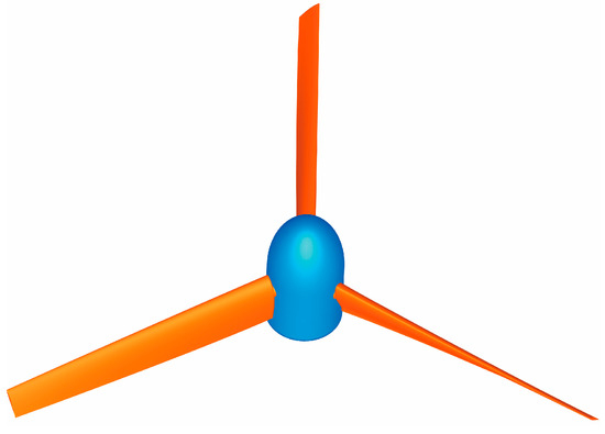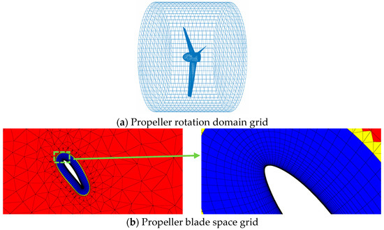 The propeller model used in this paper is shown in Figure 7. The model includes a three-bladed propeller with a propeller radius of 0.525 m, a hub radius of 0.606 m, and a pitch angle of 56° at the 70% radius position. Figure 8 shows the grid of propeller. The geometric model of the propeller is meshed using Pointwise V18.5R1 software based on the unstructured mesh generation method. Also, the T-Rex technique was used to generate a high-quality boundary layer mesh with a maximum Y+ less than 1.0 near the wall. The computational domain was divided into two parts: the inner part, which is the rotating region with the propeller, and the outer part, which is the non-rotating constant far-field region. CFD numerical calculations were performed using Ansys CFX software version 19.1 [27], based on the slip mesh method, with an interface between the rotating and non-rotating regions for the interpolation and exchange of data, using the transient rotor-stator setup method and the convective terms in high-resolution scheme. Boundary conditions included inflow conditions, far-field conditions, and solid-wall boundary conditions. Inlet conditions were determined based on flight altitude and velocity, considering total temperature and total pressure. The inflow direction made an angle with the inlet boundary. Far-field boundary conditions were set as open, with the turbulence intensity set to zero gradient. The propeller blades and hub were set as no-slip adiabatic wall conditions, and the initial field was set as a uniform inflow.