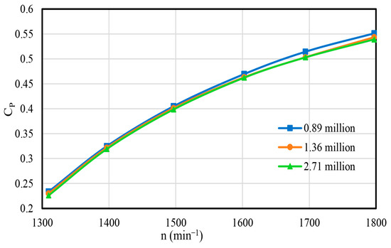 In order to minimize the influence of the mesh on the computational results, the mesh-independence of the propeller was first verified. Three different sets of grids were generated with 0.89 million, 1.36 million, and 2.71 million grids. Figure 9 shows the variation in power coefficients with rotational speed for different grids. It can be seen from Figure 9 that the calculation results with different grids are basically consistent at low RPM. However, as the speed increases, some slight differences are observed between the calculated results. Also, at a constant rotational speed, the power coefficient decreases with the increase in the grid number. When the number of grids reaches 2.71 million, the calculation results are almost the same as the 1.36 million grids, which indicates that the 1.36 million grids have reached the grid-independence requirements. Thus, the grid number 1.36 million is subsequently used for the calculation, taking into account the calculation time and calculation efficiency.