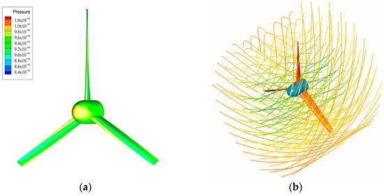 Propeller pressure contour plot and streamline distribution: (a) propeller pressure contour; (b) propeller streamline distribution.