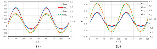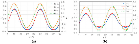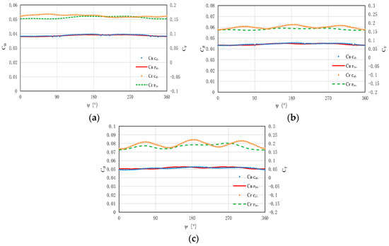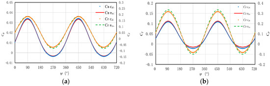 Figure 17 shows a comparison of the results when the inflow angle is 15°. Figure 18 shows the variation in the deviation with azimuth. In this case, the maximum deviation of the CB during one circle of propeller rotation is 3.90%, the maximum deviation of the CF is −5.40%, the maximum deviation of the CT is −5.70%, and the maximum deviation of the CP is −6.00%. The 1P load also shows a periodic variation, which increases in magnitude in comparison to the flow angle of 12° and 9°.