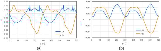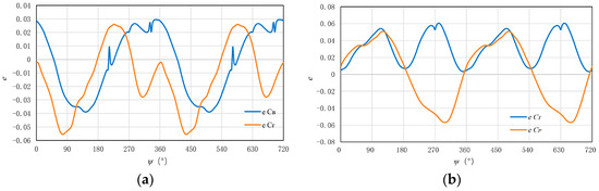 where e represents the deviation between the results of the proposed procedure and the CFD simulation results, and WPro. represents the value calculated using the proposed procedure, including CB Pro., which represents the bending moment coefficient calculated using the proposed procedure; CF Pro., which represents the tangential force coefficient calculated using the proposed procedure; CT Pro., which represents the thrust coefficient calculated using the proposed procedure; and CP Pro., which represents the power coefficient calculated using the proposed procedure. Furthermore, WCal. represents the value calculated using the CFD simulation, including CB Cal., which represents the bending moment coefficient calculated using CFD simulation; CF Cal., which represents the tangential force coefficient calculated using CFD simulation; CT Cal., which represents the thrust coefficient calculated using CFD simulation; and CP Cal., which represents the power coefficient calculated using CFD simulation. In addition, M represents the amount of pulsation of the CFD calculated value, i.e., the difference between the peaks and troughs of the CFD calculated value.