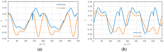Variation in the deviation with azimuth at an inflow angle of 9°: (a) e CB and e CF; (b) e CT and e CP.