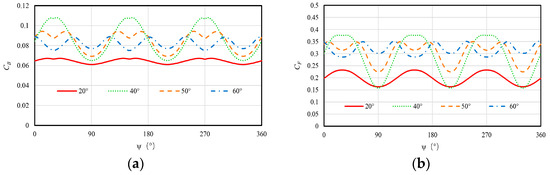 The calculation results in Figure 13, Figure 14, Figure 15, Figure 16, Figure 17, Figure 18 and Figure 19 also confirm the accuracy and reliability of the proposed method. Next, the procedure was used to calculate the variation in the CB and CF of the whole propeller with the azimuthal angle of the blade at larger inflow angles. In addition, the distribution of the CB and CF of the whole propeller was further studied under different advance ratios. Figure 20 shows the variation in the CB and CF of the whole propeller with blade azimuthal angle for large inflow angles of the propeller (20°, 40°, 50°, and 60°). It can be seen from Figure 20 that the range of fluctuations in the CB and CF of the propeller first increases and then decreases from the inflow angle of 20° to the inflow angle of 60°. Also, they all have clear variation patterns with different inflow angles. This is because in the case of a small inflow angle, the fluid flows through the propeller at a lower speed on the rotating surface of the propeller, which results in a lower bending moment and tangential force. Also, as the inflow angle increases, more force is required to push the fluid. But when the inflow angle is too large, it leads to severe separation and fluid stagnation, which then reduces the overall propeller bending moment and tangential force. On the other hand, in the case of a large inflow angle, the fluid forms non-uniform flows near the propeller. These irregular flows then cause the propeller to be subjected to highly unstable forces, which result in irregular fluctuations.