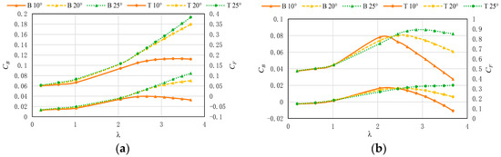 CB and CF of the whole propeller at different inflow angles: (a) CB of the whole propeller; (b) CF of the whole propeller.