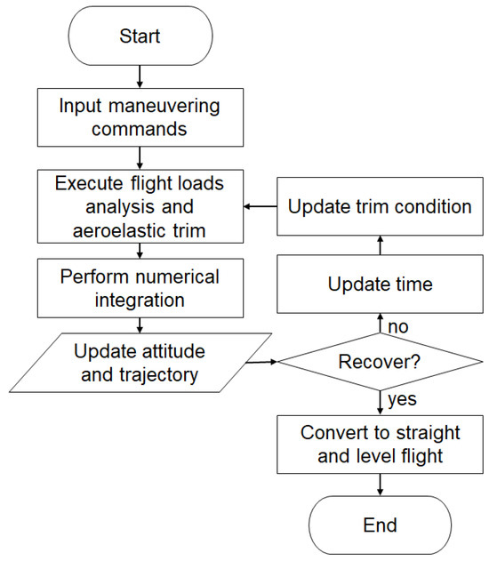 Based on the flight dynamics equations and the aeroelastic equations of longitudinal maneuvers and using the Runge–Kutta method, the maneuver loads of elastic aircraft can be analyzed, and the flowchart is shown in Figure 2.
