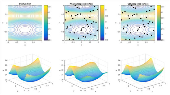 Latin hypercubic sampling was used to obtain the sample sites. The function value and gradient are calculated at each sample site. The response surfaces of universal Kriging and GEK, together with the original function, are shown in Figure 3 and Figure 4. The black dots in Figure 3 and Figure 4 represent the sampling points. The MSEs of the predicted values are shown in Table 1. Dong et al. showed that the Latin hypercube and uniform sampling methods can be used to obtain a better uniform sample space [33].
