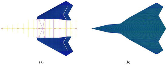 Structural finite element model and aerodynamic mesh grids of MSC.NASTRAN. (a) Structural finite element model. (b) Aerodynamic mesh grid.