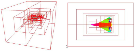 The flight load analysis is based on the static aeroelasticity module of MSC.NASTRAN. Further enhancement is achieved by integrating the Euler equations and incorporating nonlinear CFD with viscous drag correction through the MGAERO softwareV3.1. The structural mesh used in MSC.NASTRAN is a panel-bar model, the mesh number is 21,291, and the plane aerodynamic mesh number is 2114. The mesh number of the MGAERO model is 2,648,740 and the boundary conditions for subsonic and low supersonic are used. Figure 7 shows the structural finite element model and aerodynamic mesh grids of MSC.NASTRAN. Figure 8 shows the aerodynamic mesh grids of MGAERO. Combining MSC.NASTRAN and MGAERO on the flight load analysis, the aerodynamic data obtained by MGAERO are used as an external aerodynamic database and interpolated into aerodynamic mesh grids of MSC.NASTRAN. According to the data of flight conditions, Nastran performs static aeroelastic analysis by the interpolation fitting method; static aeroelastic analysis is used as a quasi-steady aerodynamic analysis method in the steady trim calculation, which can satisfy arbitrary overload conditions. The time effect is reflected by the Runge–Kutta method in the maneuvering process.