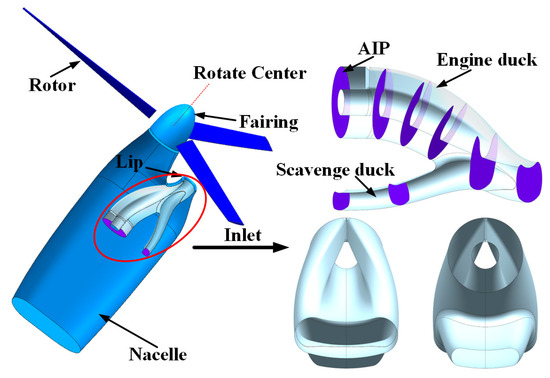 Figure 1 shows the model investigated in the present study. This model consists of three parts: the rotor, the nacelle, and the inlet. The rotor selected for the research model employs a XV-15 rotor blade profile, which has been publicly disclosed [5,26]. The relevant parameters are provided in Table 1. The nacelle has a streamlined design to reduce aerodynamic drag and enhance flight efficiency. The inlet is a single-scoop type whose main parameters are listed in Table 2. The inlet is smoothly connected to the nacelle via a lip. Due to the vertical offset between the turbo-prop engine inlet and inlet entrance, the inlet is forced to connect to the aerodynamic interface plane (AIP) in an “S” shape. Additionally, since tiltrotor aircraft frequently operate in dusty environments, the inlet is equipped with a scavenge duct to expel foreign objects. The lip is characterized by a sharp profile to optimize aerodynamic performance and reduce flight drag at cruise conditions.