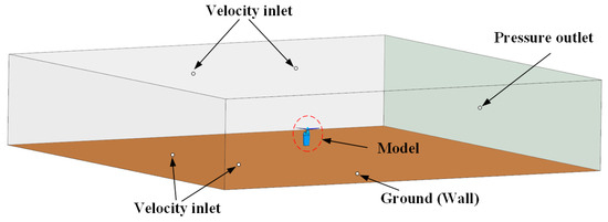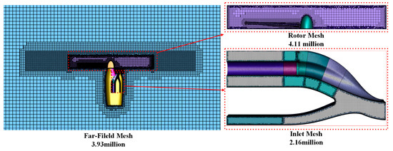 To obtain the internal flow characteristics of the tiltrotor aircraft inlet, we applied the finite volume method to discretize the three-dimensional Reynolds-averaged Navier–Stokes equations using the Unsteady Reynolds-Averaged Navier–Stokes (URANS) approach. Due to the low velocities of the tiltrotor aircraft while hovering and the surrounding air, a pressure-based solver was employed for flow field computations. Discretization of the Navier–Stokes equations was performed using a second-order upwind scheme, and the velocity and pressure fields were corrected using the SIMPLEC algorithm. The turbulent viscosity was calculated using the SST k-w model proposed by Menter [30], which was shown to effectively predict three-dimensional complex flow structures with adverse pressure gradients in the inlet duct [31,32,33]. In addition, we selected a rotor speed of 589 RPM and transient time step sizes of 2.83 × 10−4 s based on the time needed for the rotor to rotate by 1°. In addition, the height from the propeller to the ground was 2.2 R. The details of the computational domain are depicted in Figure 2. To mitigate the boundary effects on the CFD results, the width of the computational domain was 40 times the length of the inlet, and the height was 13 times the length of the inlet. Moreover, a straight section was added at the exit of the inlet, corresponding to 1.5 times the diameter of the inlet exit diameter.