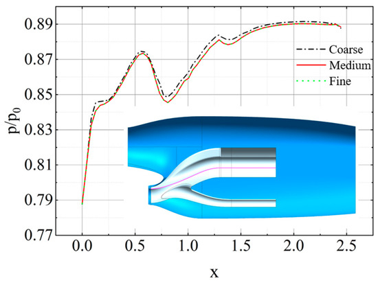 Here, the entire computational domain was filled with hexahedral and polyhedral cells using the Fluent Meshing 2021R1 software for mesh generation. The computational domain features stationary and rotating regions, with data exchange between the two regions occurring through interface boundaries. To meet the turbulence model’s requirement for a y+ value of approximately 1, mesh refinement was applied near the wall surfaces. Additionally, to validate mesh independence, three sets of meshes with varying levels of density—coarse, medium, and fine—were established. The mesh height of the first layer was the same across all three sets of meshes. The mesh sizes for each set were as follows: 7.21 million, 10.20 million, and 14.31 million. The medium grid, as shown in Figure 3, consisted of 10.20 million cells, with the rotational region containing 4.11 million cells, the inlet region containing 2.16 million cells, and the far-field region containing 3.93 million cells. Using these three sets of meshes, we can simulate the flow field inside the inlet of the hovering tiltrotor aircraft at a flow velocity of 0 m/s. The time-averaged pressure distribution along the inlet wall at the 9th rotation of the rotor is illustrated in Figure 4. Notably, the results obtained from the three sets of grids exhibit consistent trends. However, the results obtained from the coarse grid are significantly higher than those obtained from the medium and fine meshes, whose results almost overlap. Considering computational efficiency and accuracy, the medium mesh was ultimately used for further investigations.