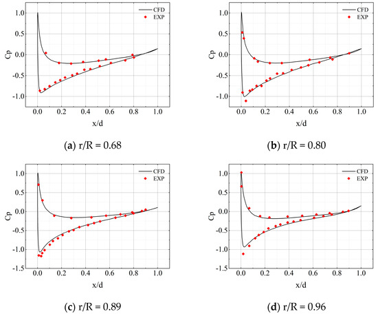 In the numerical simulation conditions for the rotor, we selected a blade tip with a Mach number of 0.526 and collective pitch of 8°. Figure 6 compares the pressure coefficients at different locations along the rotor blade profiles. Overall, we observed excellent agreement between the simulation results and experimental values. This result effectively demonstrates that the simulation method utilized in this study accurately represents the flow field information around the rotor.