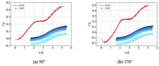To further validate the predictive capabilities of the simulation method for the internal flow of the inlet, an S-shaped diffuser test case from NASA Lewis Research Center [36] was utilized for further verification. A comparison of the pressure distributions along the axial sections at circumferential angles of 90° and 170° is presented in Figure 7. The simulation results are also in a good agreement with the experimental results, further demonstrating the accuracy of the simulation method adopted in this study.
