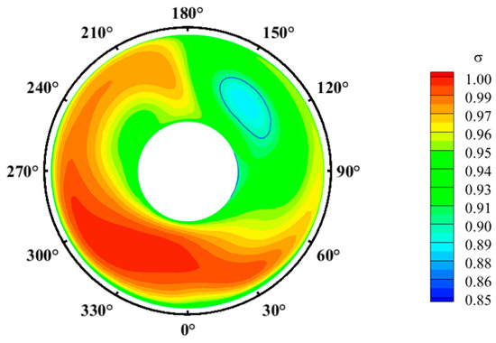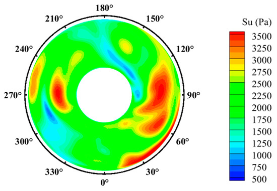 where is the total pressure at each moment within one period on the AIP, and is the time-averaged total pressure within one period. Figure 17 illustrates the distribution of Su on the AIP. Significant pressure pulsations are clearly present within the inlet, with larger fluctuations concentrated primarily on both sides of transverse vortex pair 2. These fluctuations can be attributed to the larger scale of the inlet and the stronger swirling effects induced by the rotor. Under the influence of the rotor, transverse vortex pair 2 undergoes periodic changes in size and position on both sides of the shaft, resulting in intense interactions between its fluid and the mainstream. Subsequently, this interaction causes strong unsteady disturbances at the edges of transverse vortex pair 2. This interaction significantly affects variations in the size of transverse vortex pair 3 due to continuous changes in transverse vortex pair 2, resulting in larger total pressure fluctuations near the wall within the range of 240° to 270°. Additionally, strong pressure pulsations exist in the boundary layer from 15° to 90° on the AIP and in some mainstream regions. This result is attributed to the movement of streamwise vortices under the rotor’s effects continuously traversing the bottom surface of the inlet and interacting with air inside the boundary layer. This interaction becomes further intensified by the presence of transverse vortex pair 2 in the range of 30° to 60°, leading to relatively higher total pressure fluctuations from 15° to 90° near the boundary layer on the AIP.