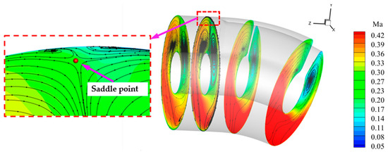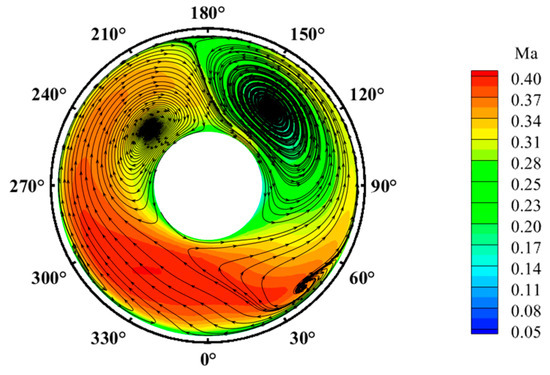 Figure 13 presents the time-averaged Mach number and secondary flow streamlines along the inlet cross-section. It can be observed that air in the engine duct must flow around both sides of the driving shaft. According to the theory of flow around slender bodies [37], this type of airflow will result in the formation of a stable pair of vortices behind the shaft, named transverse vortex pair 2. After vortex pair 2 forms, it continues to develop along the direction of the fluid flow and eventually converges as the airflow transitions to a circular cross-section at the inlet. Subsequently, a saddle point forms above the cross-section, where the air flows both above and below the saddle point. As the air flows upward and contacts the upper wall, it begins to induce the migration of air near the boundary layer to both sides. Eventually, transverse vortex pair 1 forms under the influence of adverse pressure gradients. Since the fluid within transverse vortex pair 1 mainly consists of fluid near the boundary layer, its total pressure is relatively low. However, due to its small scale, the fluid’s effect on the performance of the inlet is minimal.
